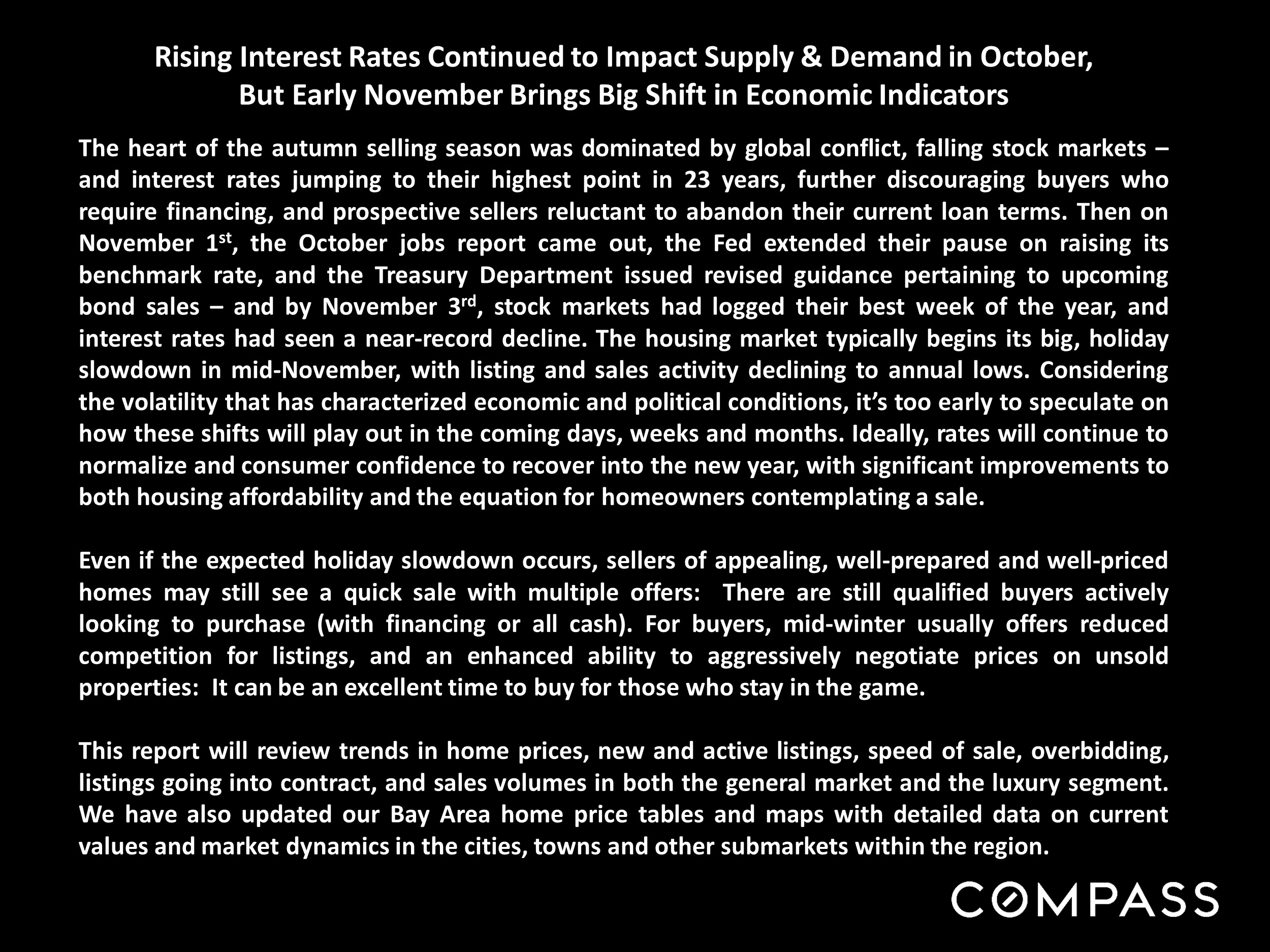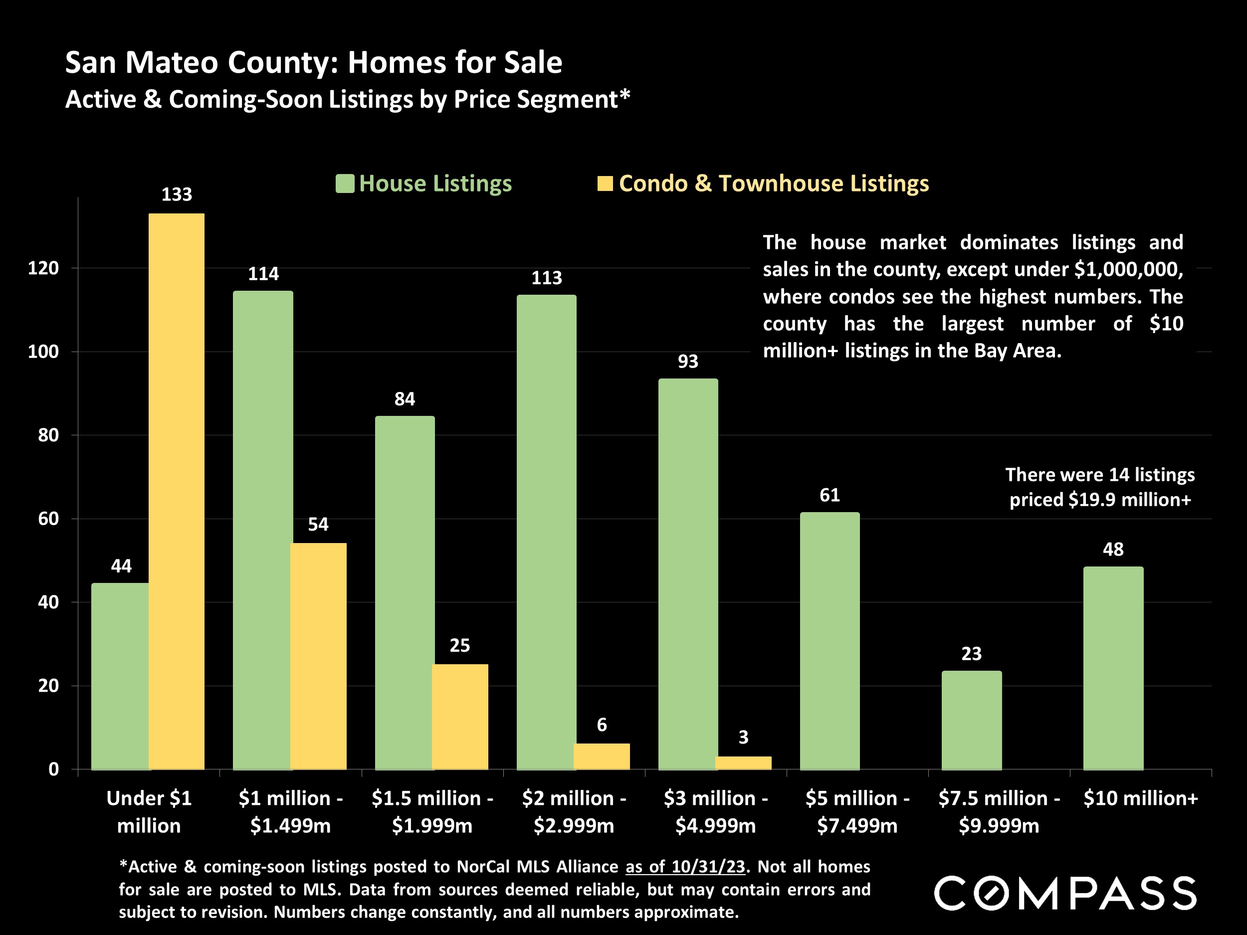 Statistics are generalities, essentially summaries of widely disparate data generated by dozens, hundreds or thousands of unique, individual sales occurring within different time periods. They are best seen not as precise measurements, but as broad, comparative indicators, with reasonable margins of error. Anomalous fluctuations in statistics are not uncommon, especially in smaller, expensive market segments. Last period data should be considered estimates that may change with late-reported data. Different analytics programs sometimes define statistics - such as "active listings," "days on market," and "months supply of inventory" - differently: what is most meaningful are not specific calculations but the trends they illustrate. Most listing and sales data derives from the local or regional multi-listing service (MLS) of the area specified in the analysis, but not all listings or sales are reported to MLS and these won't be reflected in the data. "Homes" signifies real-property, single-household housing units: houses, condos, co-ops, townhouses, duets and TICs (but not mobile homes), as applicable to each market. City/town names refer specifically to the named cities and towns, or their MLS areas, unless otherwise delineated. MultiÂcounty metro areas will be specified as such. Data from sources deemed reliable, but may contain errors and subject to revision. All numbers to be considered approximate. Many aspects of value cannot be adequately reflected in median and average statistics: curb appeal, age, condition, amenities, views, lot size, quality of outdoor space, "bonus" rooms, additional parking, quality of location within the neighborhood, and so on. How any of these statistics apply to any particular home is unknown without a specific comparative market analysis. |