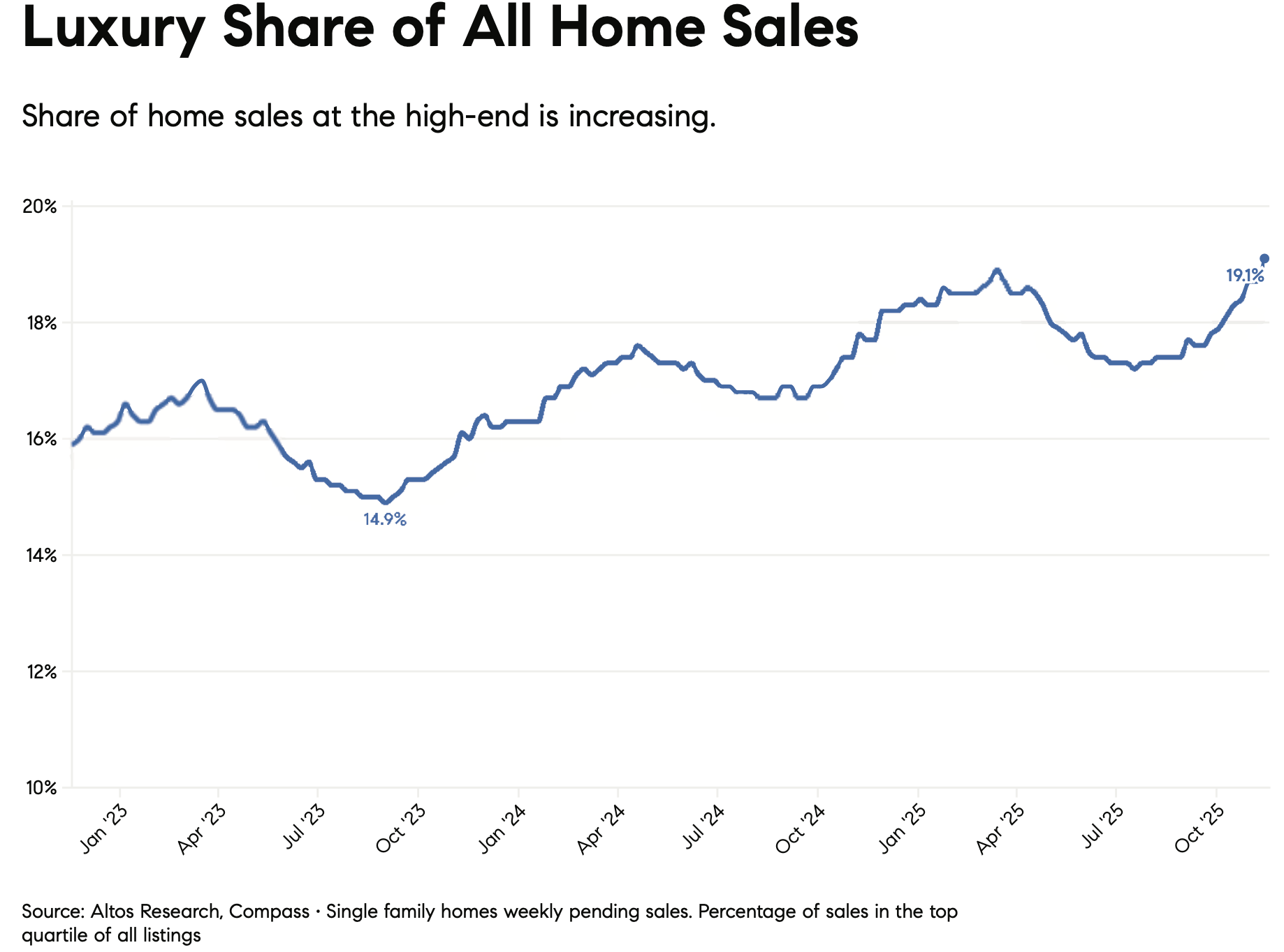 Luxury homes are expected to continue outperforming entry-level price points, largely because higher-income buyers are less sensitive to mortgage rates and often purchase with cash.